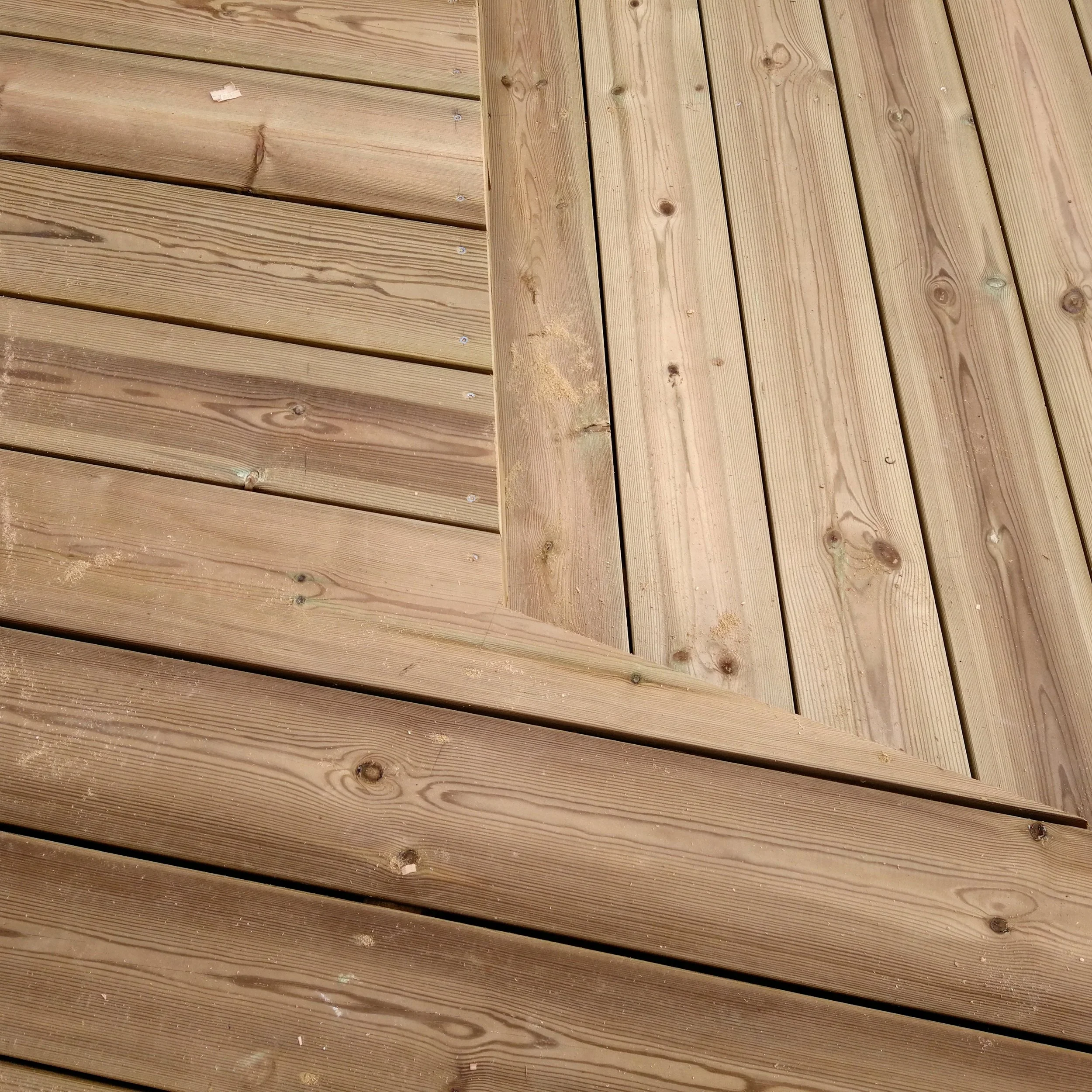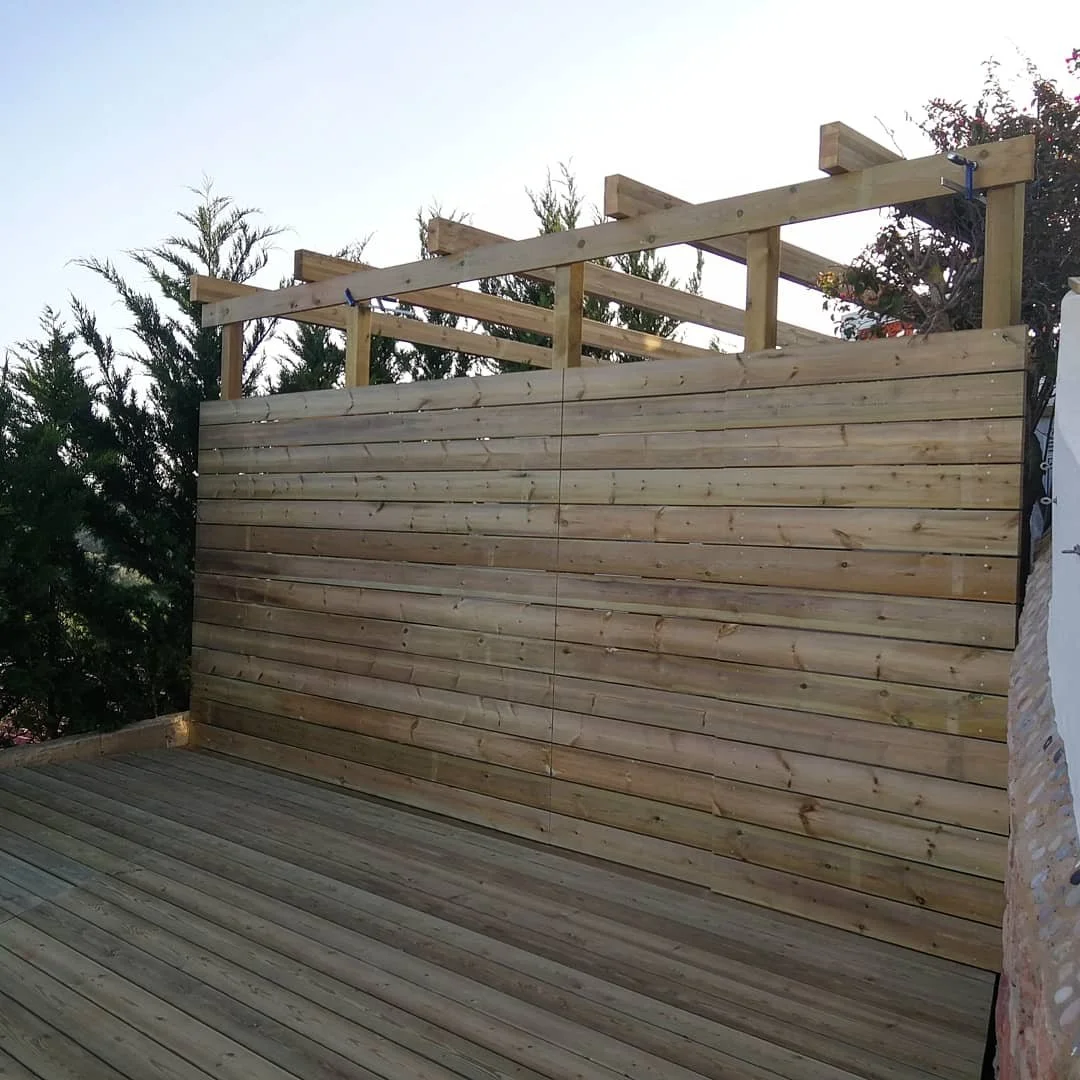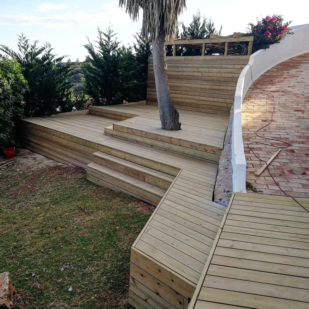 This bespoke wooden decking project is designed to enhance the outdoor landscape while respecting existing natural elements. Constructed from durable, pressure-treated timber, the decking features multiple stepped levels that follow the natural slope of the terrain, creating a fluid and harmonious outdoor space.The design thoughtfully integrates an existing tree, allowing the deck to wrap around it seamlessly without compromising structure or aesthetics. Wide steps provide comfortable transitions between levels. A privacy screen at the rear adds visual structure and shelter, making the space ideal for relaxation, entertaining, or quiet seating areas.