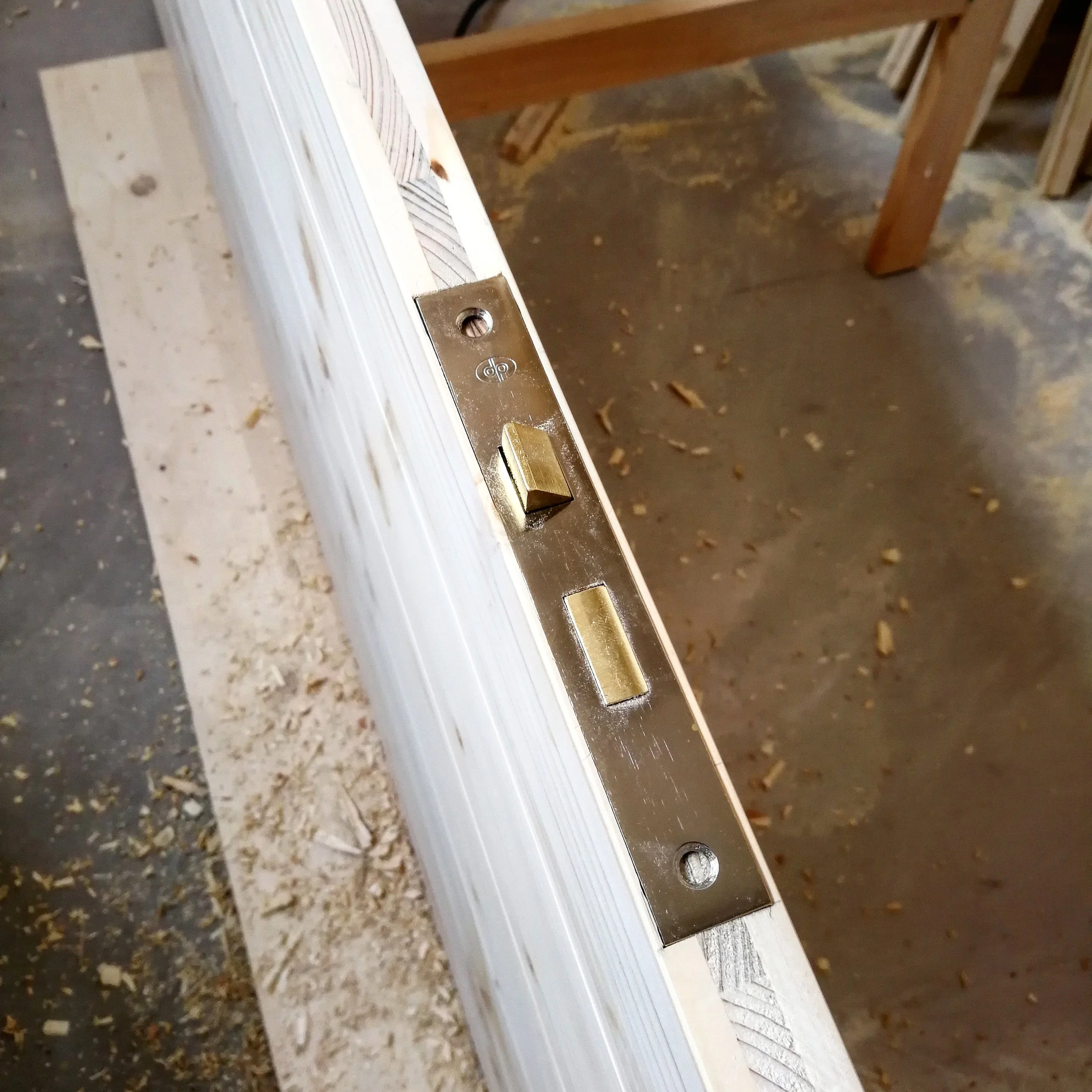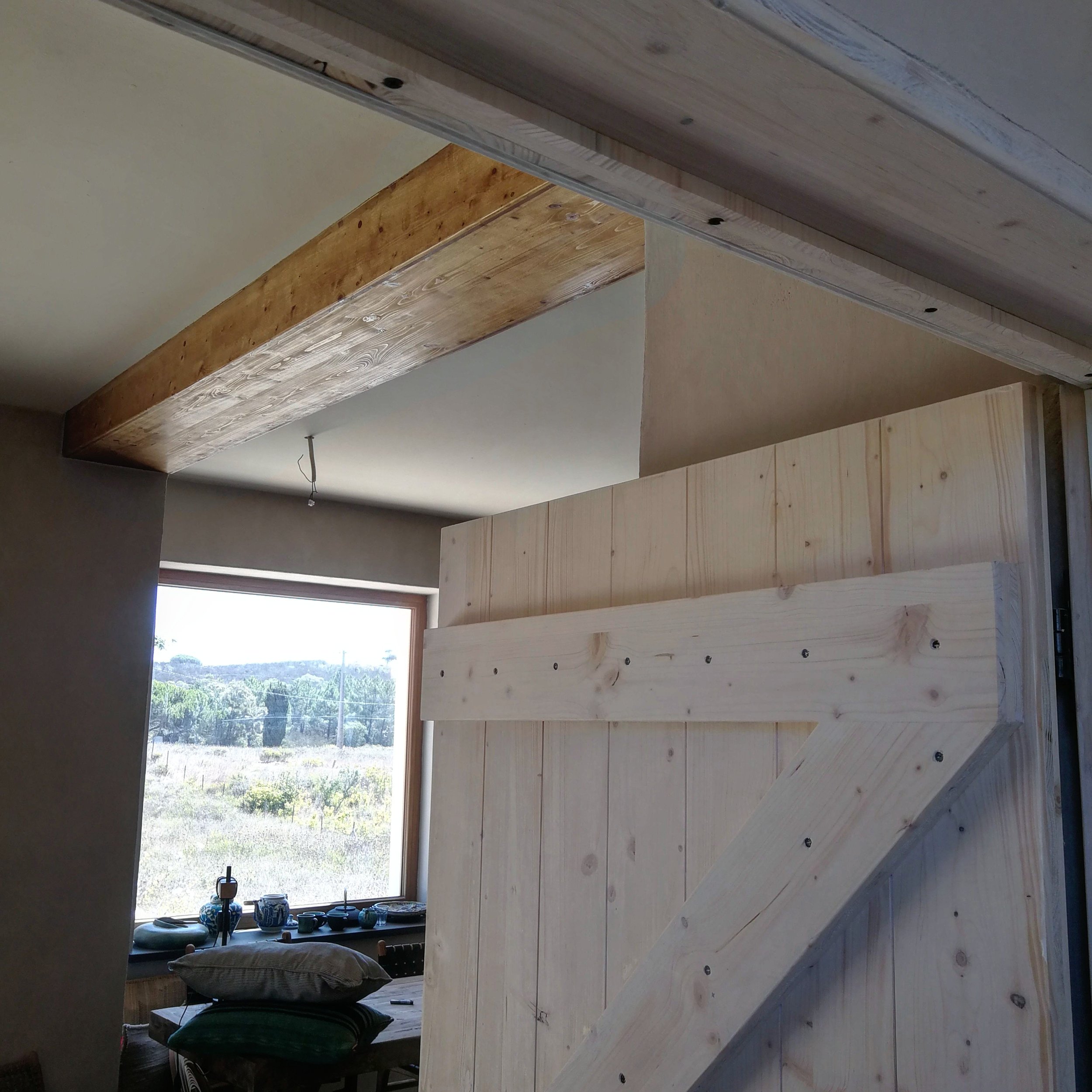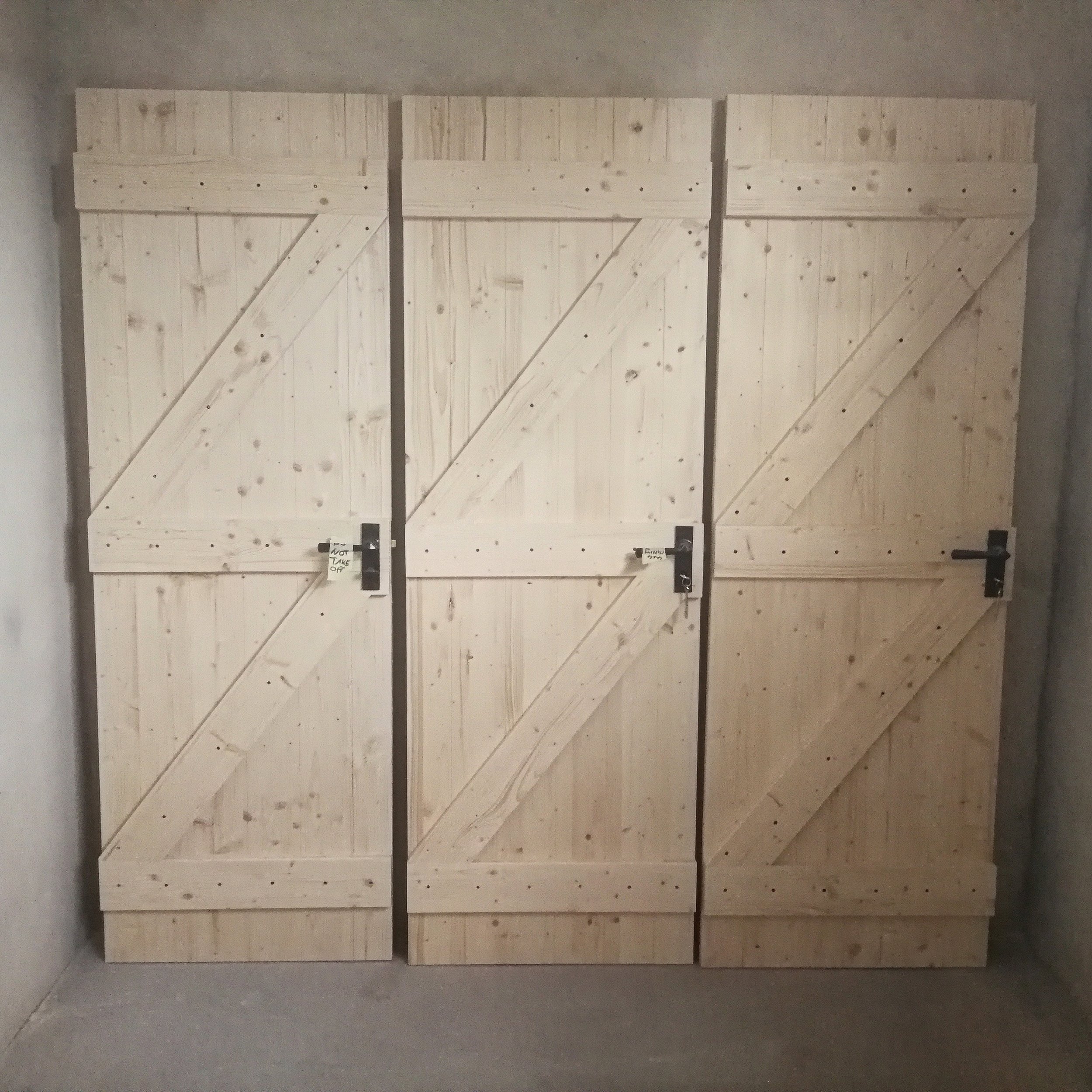 Crafted from high-quality solid wood, this custom-made door and built-in wardrobe system combines timeless design with durable craftsmanship. The clean vertical paneling highlights the natural beauty of the wood grain, while the traditional black iron hinges and fittings add a subtle rustic character.