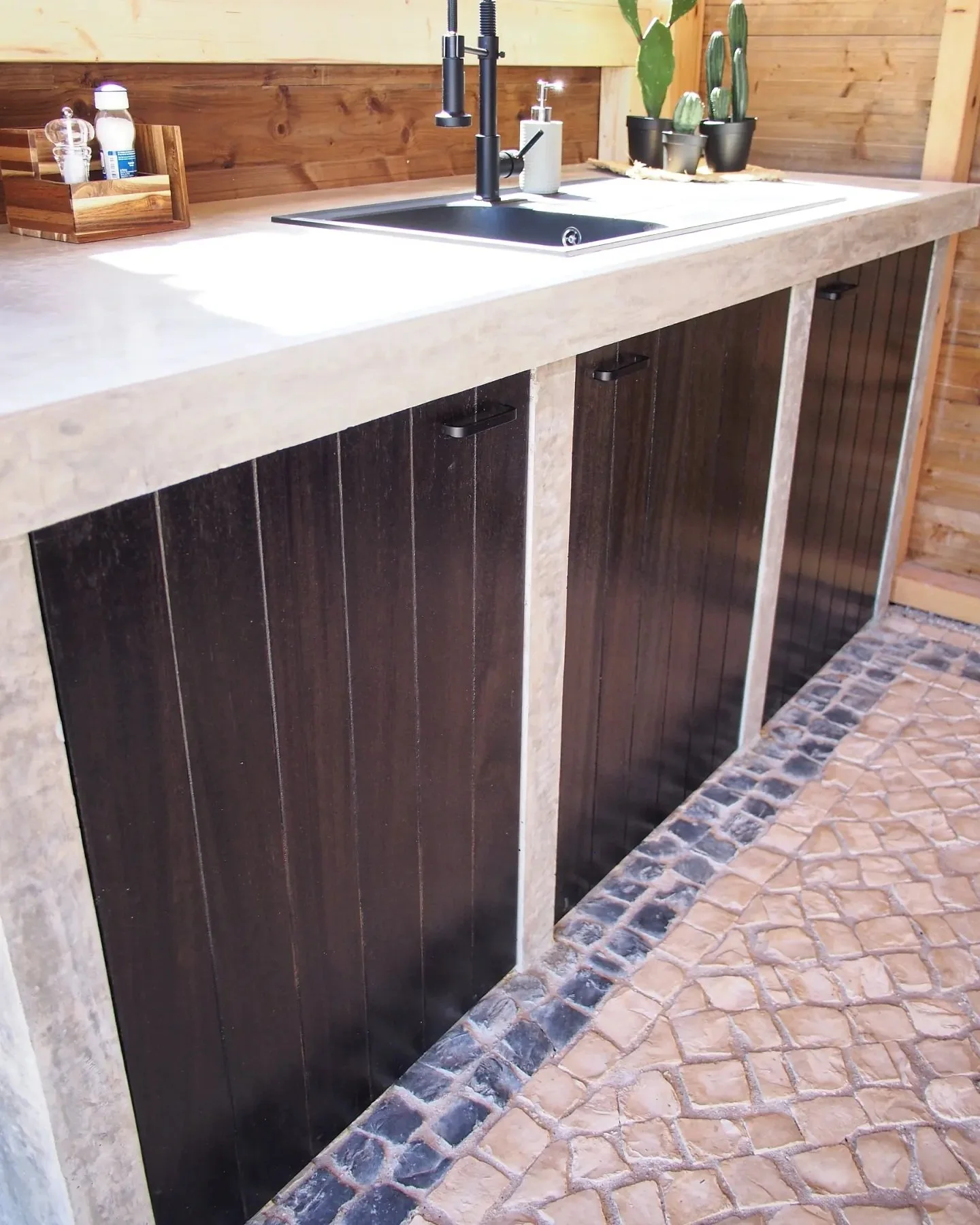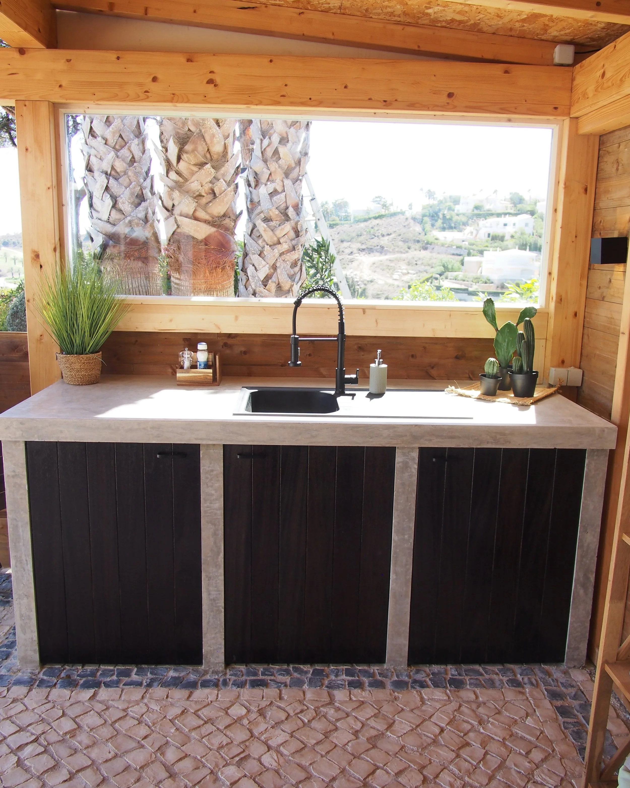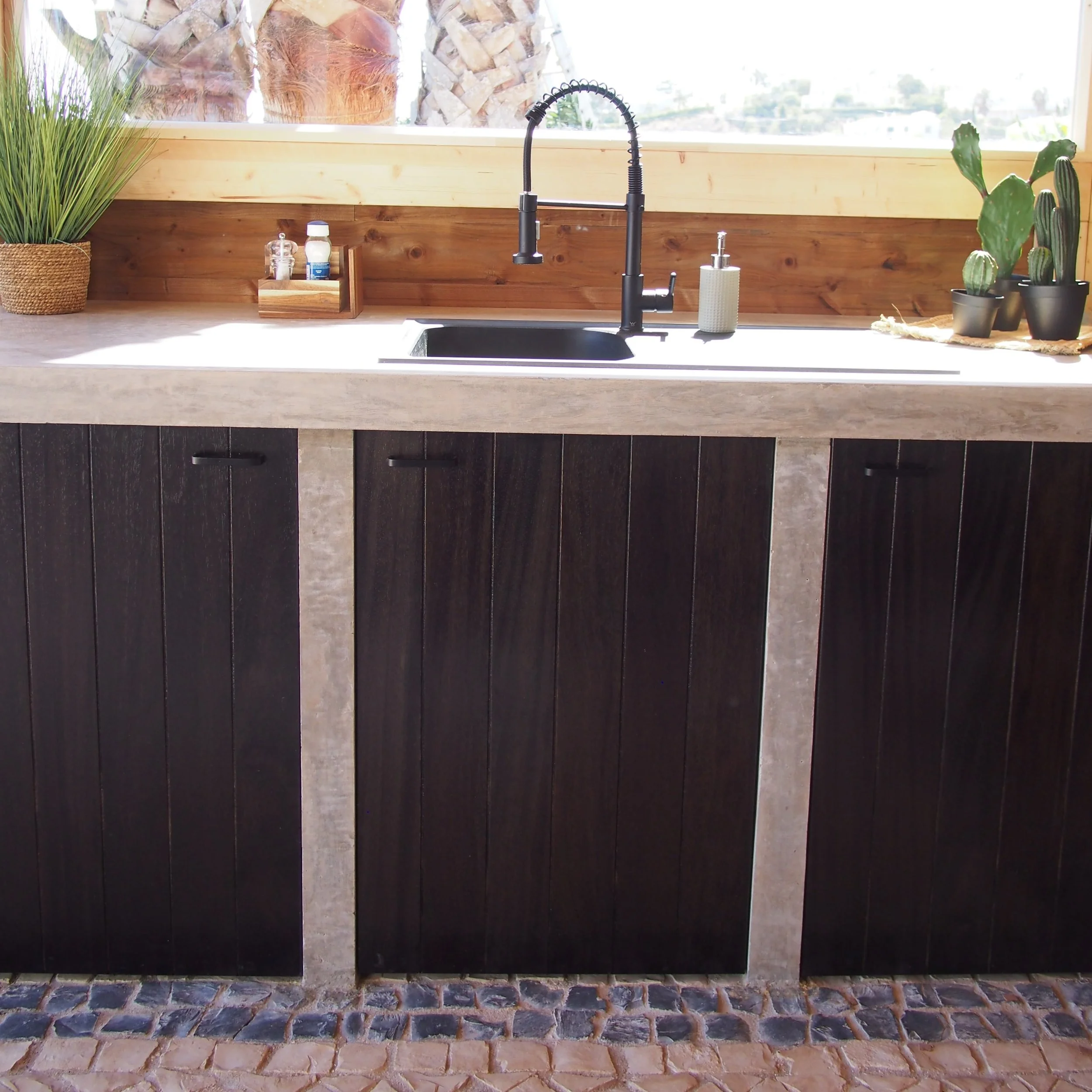 Outdoor concrete kitchen featuring black-stained Iroko hardwood doors