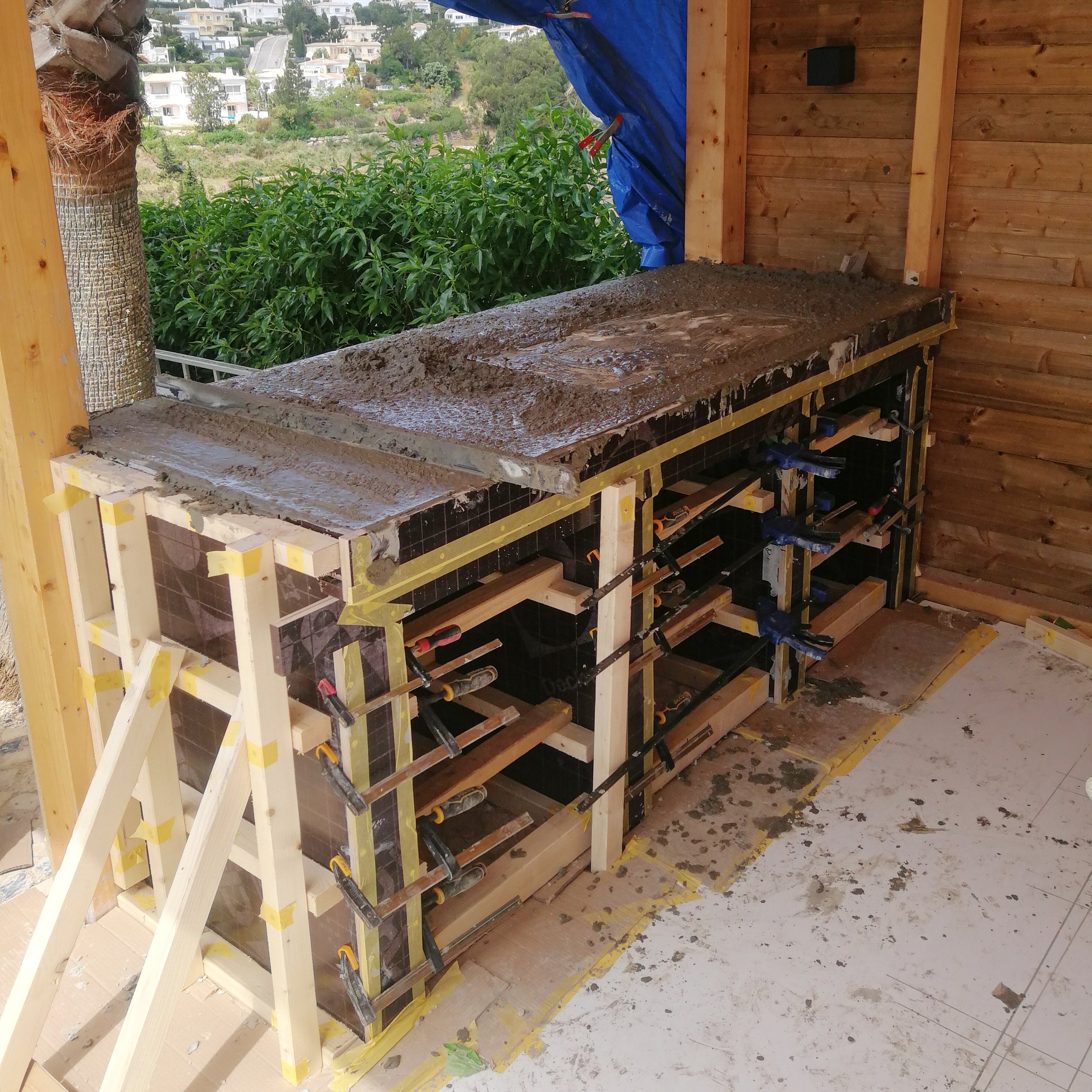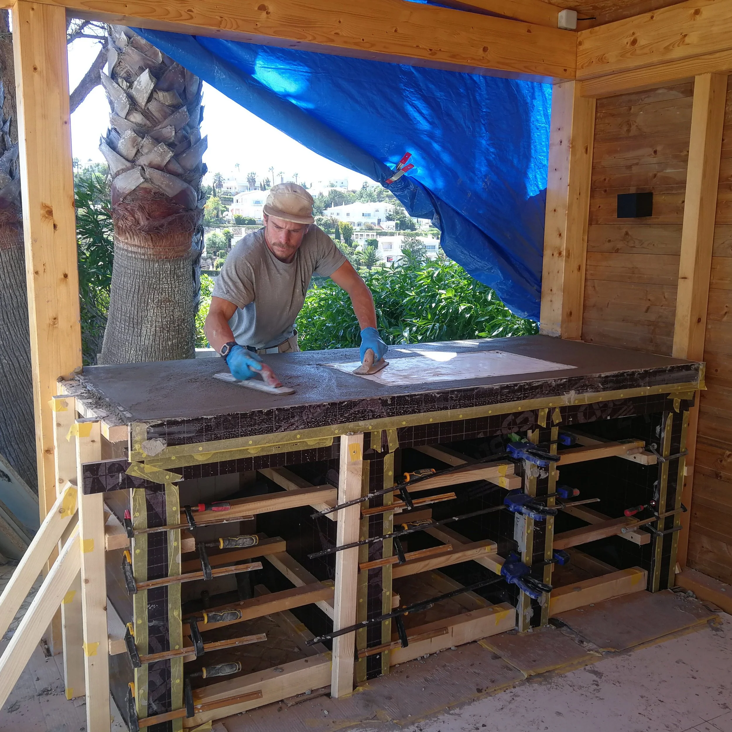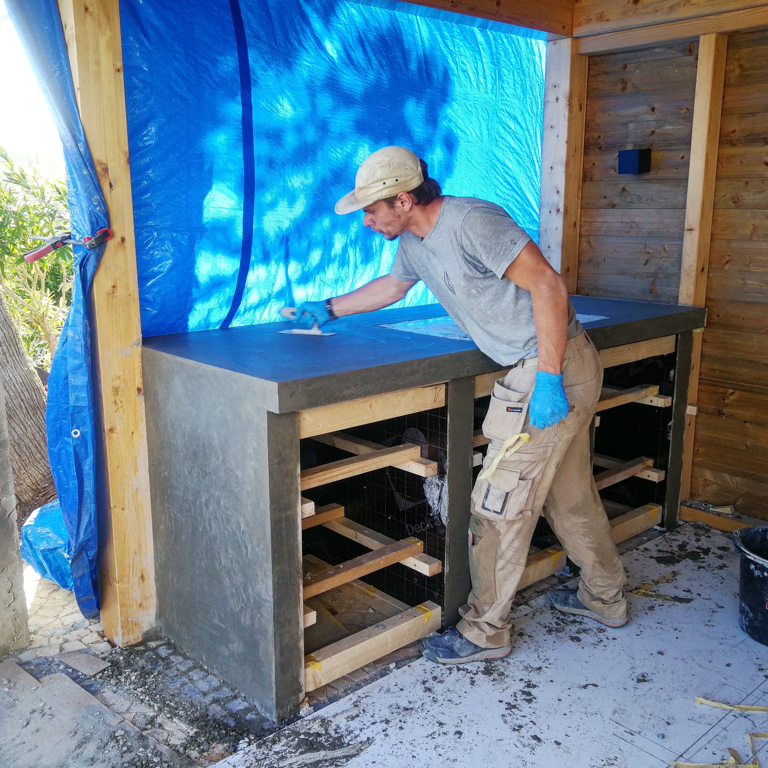 Outdoor concrete kitchen featuring black-stained Iroko hardwood doors